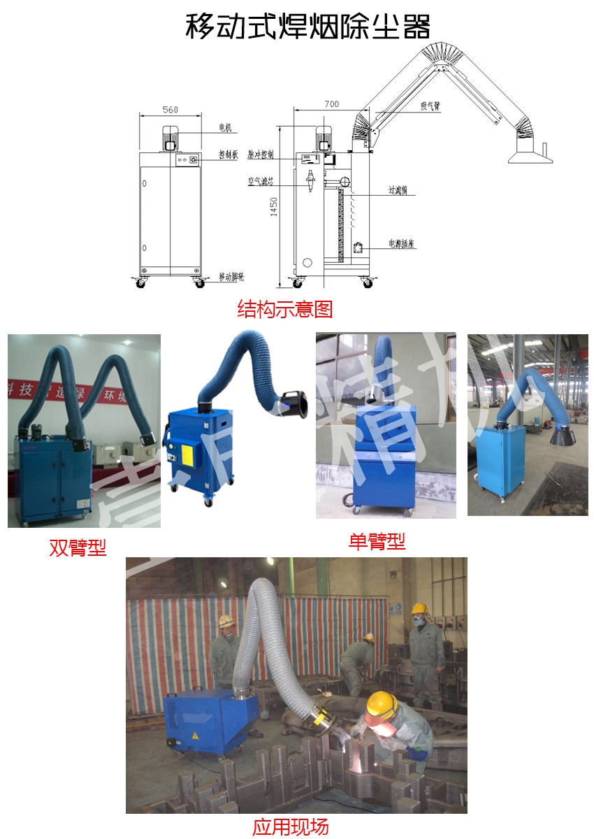 用于焊接、拋光、切割、打磨等工序中產(chǎn)生煙塵和粉塵的凈化以及對(duì)稀有金屬、貴重物料的回收等,可凈化大量懸浮在空氣中對(duì)人體有害的細(xì)小金屬顆粒。具有凈化效率高、噪聲低、使用靈活、占地面積小等特點(diǎn)。適用于電弧焊、二氧化碳保護(hù)焊、MAG焊接、碳弧氣刨焊、氣熔割、特殊焊接等產(chǎn)生煙氣的作業(yè)場(chǎng)所。